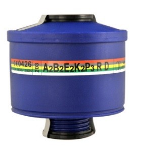 Filtro combinato a vite unificata EN 148-1 per vapori organici con punto di ebollizione superiore a 65°C, gas e vapori inorganici, Anidride Solforosa (SO2 ), Ammoniaca (NH3 ) e suoi derivati, polveri, fumi e nebbie. Il filtro può essere utilizzato con maschere intere o semimaschere TR82, TR2002 CL2 e TR2002 CL3 o similari, purché dotate di raccordo EN 148-1.