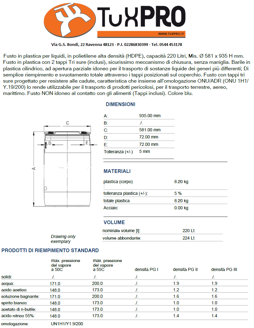 Fusto in plastica per liquidi, in polietilene alta densità (HDPE), capacità 220 Litri, Mis. Ø 581 x 935 H mm. Fusto in plastica con 2 tappi Tri sure (inclusi), sicurissimo meccanismo di chiusura, senza maniglia. Barile in plastica idoneo al contatto con gli alimenti e studiato per l'utilizzo in ambito HACCP. Fusto in plastica sezione cilindrica, ad apertura parziale idoneo per il trasporto di sostanze liquide dei generi più differenti; Di semplice riempimento e svuotamento totale attraverso i tappi posizionati sul coperchio. Fusto con tappi tri sure progettato per resistere alle cadute, caratteristica che insieme allomologazione ONU/ADR (ONU 1H1/Y.19/200) lo rende utilizzabile per il trasporto di prodotti pericolosi, per il trasporto terrestre, aereo, marittimo. Fusto idoneo al contatto con gli alimenti, utilizzabile anche per acqua, per benzina, per vino, per olio e per prodotti liquidi in genere. (Tappi inclusi). Colore blu.