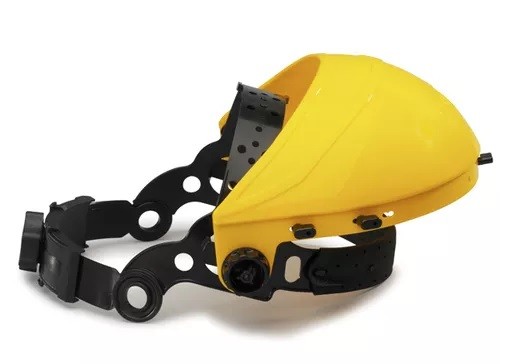 Archetto in polipropilene nero regolabile in 3 posizioni, regolazione tramite cricchetto, calotta frontale protettiva in polipropilene giallo, pelle di pecora assorbimento del sudore sulla fronte.