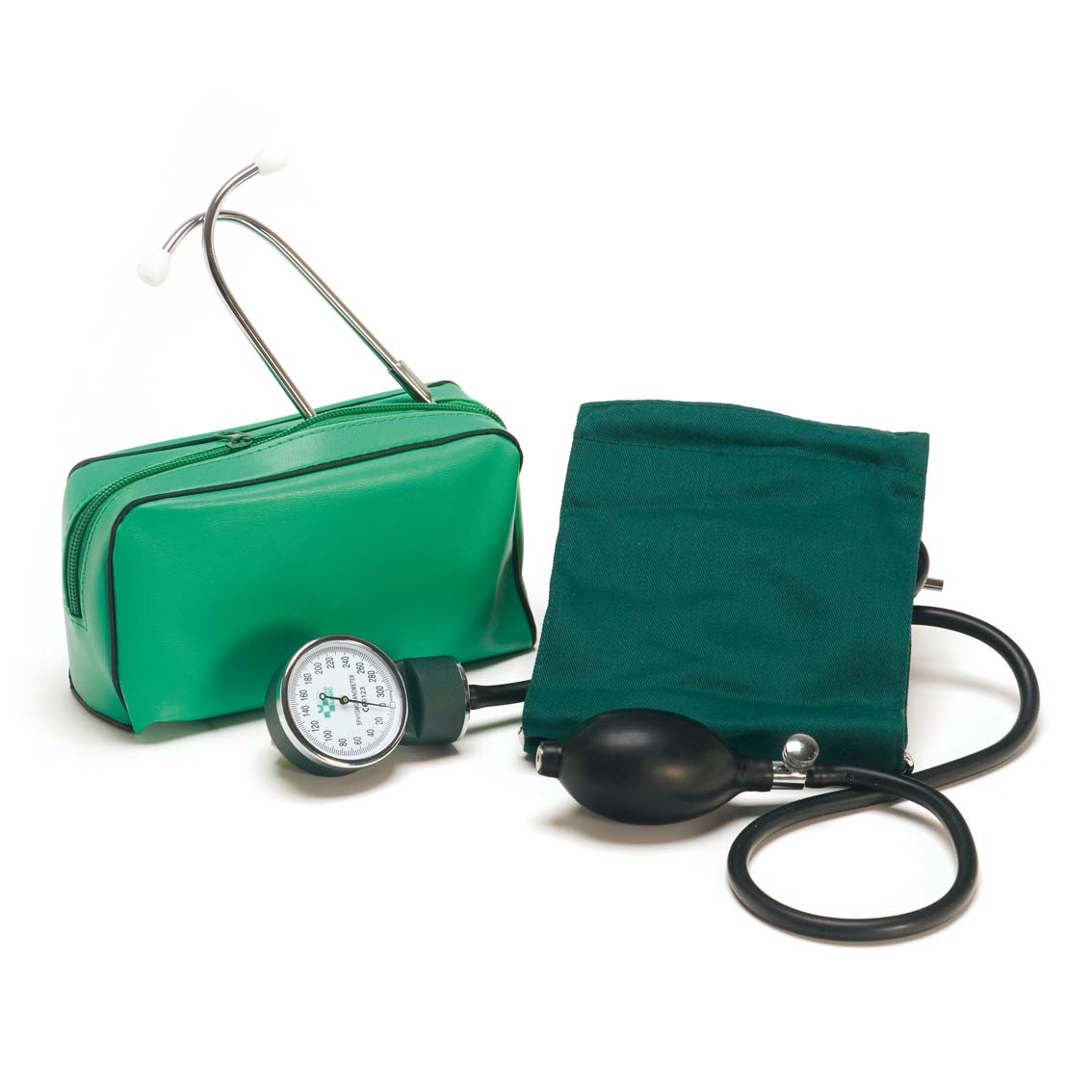 Manometro in lega leggera. Tolleranza +/-3 mm/Hg. Completo di bracciale per adulto in materiale sintetico con chiusura velcro e anello in metallo.