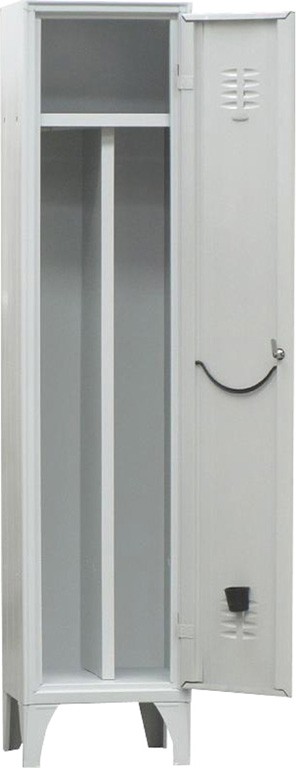 Armadio spogliatoio ad unica anta battente con tramezza sporco/pulito su piedi - struttura portante realizzata in lamiera d'acciaio spessore 6/10 - dimensioni 40x50x180H cm - ripiano superiore con sottostante tubo ovale porta grucce in PVC completo di ganci scorrevoli - porta ombrello a vaschetta raccogli gocce sull'anta - porta cartellino - serratura a cilindro con doppia chiave in dotazione - ante rinforzate e dotate di feritoie di aerazione nella parte superiore e inferiore - cerniere interne speciali antiscasso - bordo frontale perimetrale arrotondato anti urto raggio 6 mm - nervature longitudinali su fianchi e porte - asole sul tetto per consentire un'ottima circolazione dell'aria - vernice acrilica - colore grigio RAL 7035 -