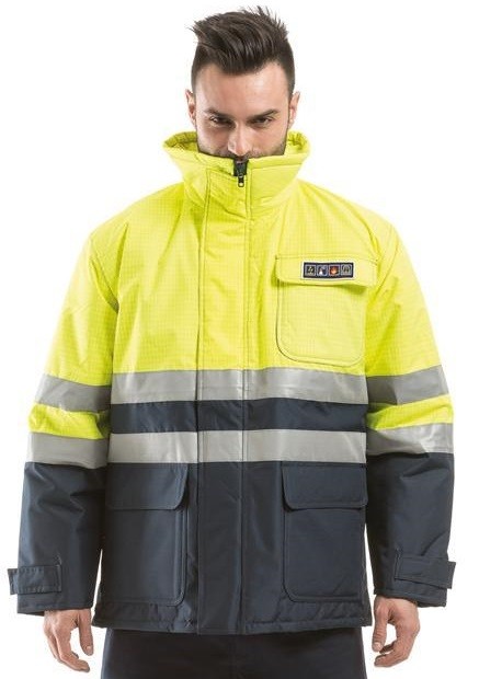 Giaccone chiusura con cerniera in plastica ricoperta da patella con velcro alle estremità.