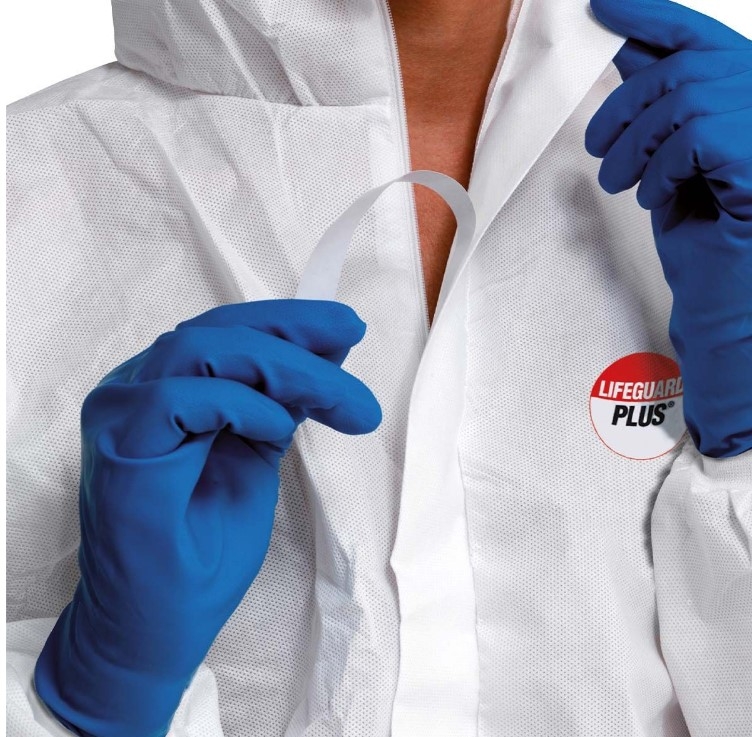Tuta protettiva monouso Lifeguard Plus in tessuto laminato di colore bianco con cappuccio