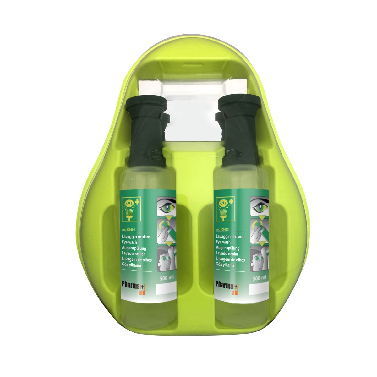 Stazione per il lavaggio oculare d’emergenza, composto da 2 soluzioni per lavaggio da 500 ml con tappo integrale premontato per un rapido utilizzo e 1 specchietto. Fornito con viti e tasselli per l’applicazione a parete.