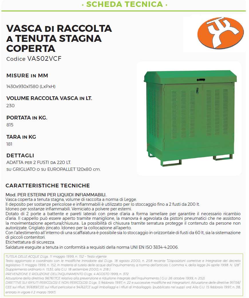 Il deposito per sostanze pericolose e infiammabili è utilizzato per lo stoccaggio fino a 4 fusti da 200 lt. su grigliato o europallet 120×80 cm.